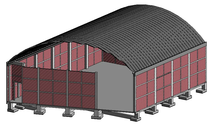Plantilla editable de bodega de mampostería con arcotecho y cimentación de zapatas aisladas.